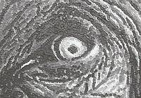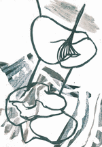„Sei still“, 2006, Blütenstempel/Rotstift auf Grau-Karton,